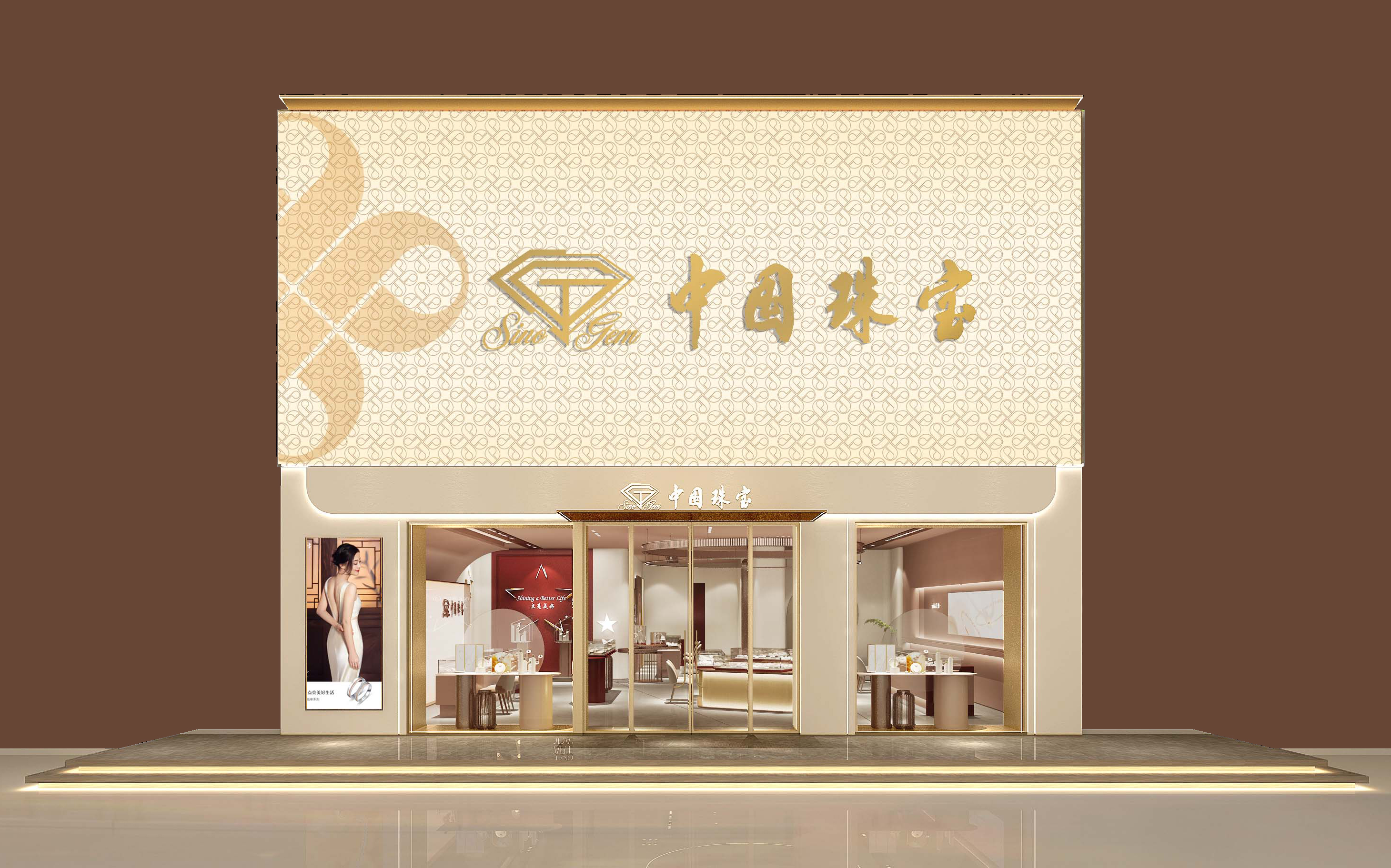 “中国珠宝”品牌全新SI系统,门头底色的花纹由保利“P”组合成中国结的图腾形式,蕴含更深层的企业文化也昭示着“中国珠宝”品牌的央企背景。