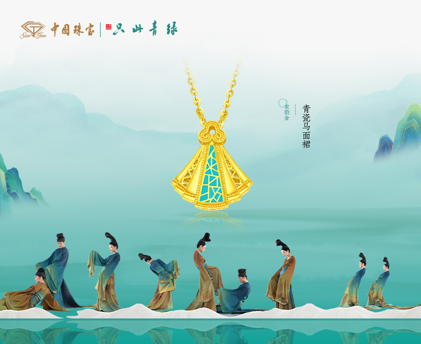 2023年,中国珠宝获《只此青绿》出品方中国东方演艺集团授权,推出“只此青绿 · 闪耀芳华"系列国潮黄金首饰再现传承千年的瑰丽青绿之色,演绎中华美学珠宝魅力。只此青绿"系列以古法黄金、珐琅、黄金花丝三大中国非遗金饰技艺创新研发,承袭宋代简约凝练的美学风格辅以现代首饰设计语言的创新表达,为大众带来中华美学珠宝的全新体验。