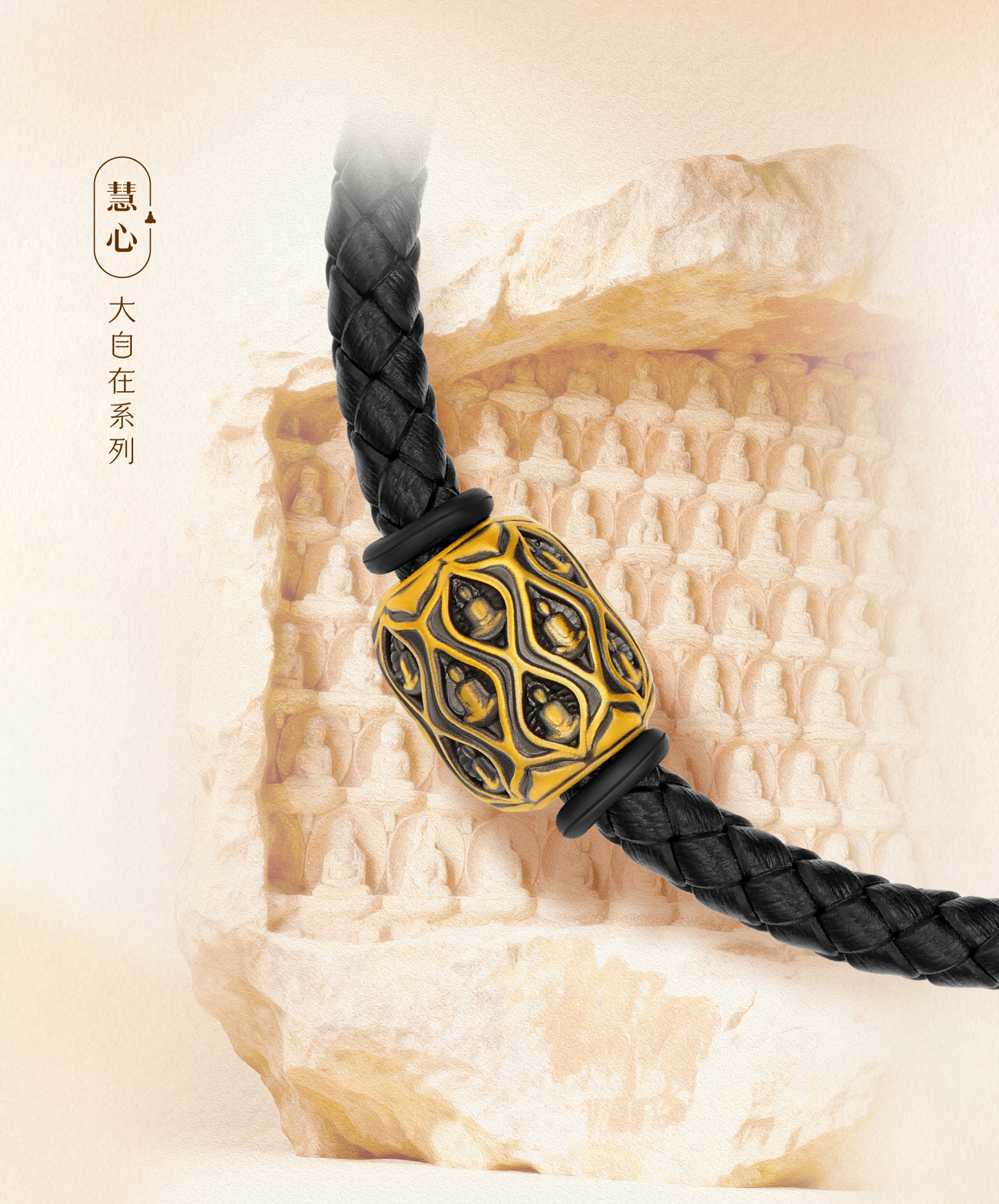设计溯源大足石刻,取菩提叶之形,裹藏无相佛之韵--叶脉如佛光金线流转,无相佛隐于叶心,似藏